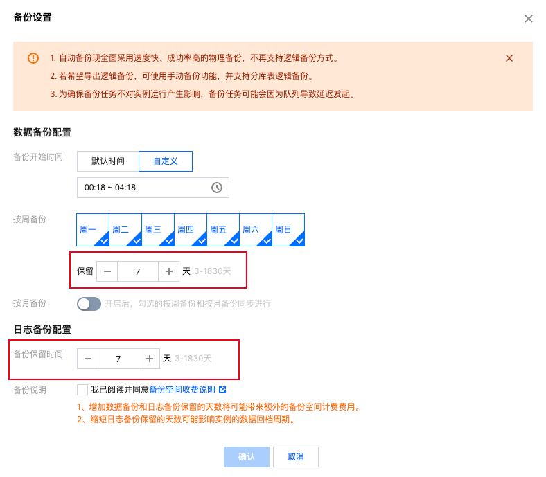 若您希望将备份文件的存在时长统一进行修改,可在实例管理的备份恢复页,单击自动备份设置。您可对备份保留天数进行修改,支持填写范围3-1830天。配置修改后再生成的备份文件将采用新的保留时间。