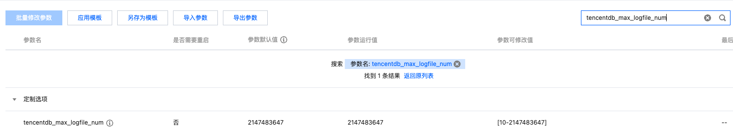 如您在控制台无法更改参数 tencentdb_max_logfile_num,请升级内核小版本。
