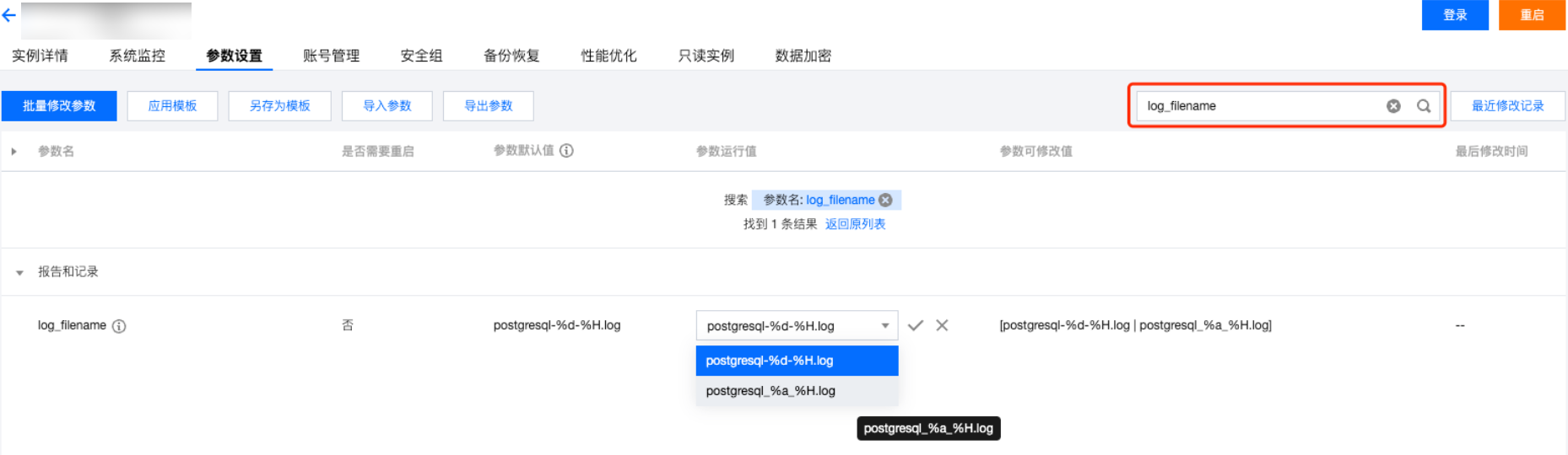 当您修改了 log_filename 参数之后,您可以通过修改参数 tencentdb_max_logfile_num 来设置运行日志保留个数,进而清理历史的日志文件。系统默认每小时生成一个日志文件,因此如果 log_filename 参数值设置为 postgresql_%a_%H.log(7天),则 tencentdb_max_logfile_num 建议设置为168及以上数字。如果 log_filename 参数值设置为 postgresql_%d_%H.log(30天),则 tencentdb_max_logfile_num 建议设置为720及以上数字。您可以在实例详情页找到参数设置,在右上方搜索框中搜索需要设置的参数 tencentdb_max_logfile_num 并更新: