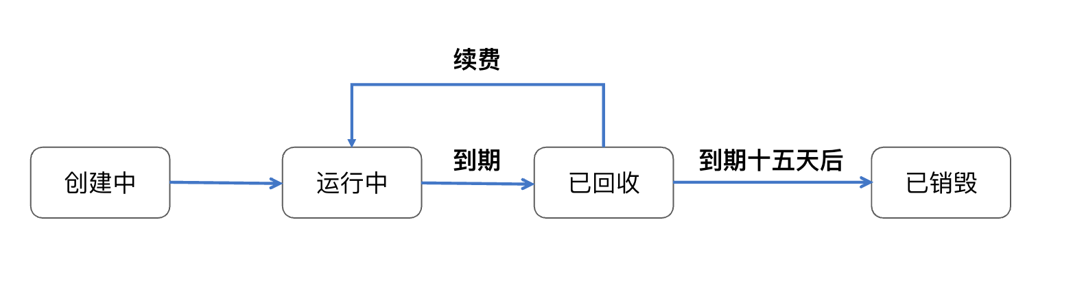 已回收 | 稳定状态 | 包年包月专用宿主机到期15天内,处于回收站内的状态。此状态不对外服务。续费后恢复运行中的状态。 |
