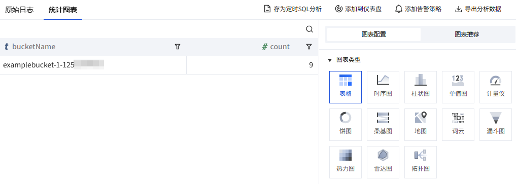 统计图表:当检索分析语句包含 SQL 语句时,可在统计图表中查看分析结果,同时还可在原始日志中查看符合检索条件的日志,以便于对比分析统计结果及原始日志。