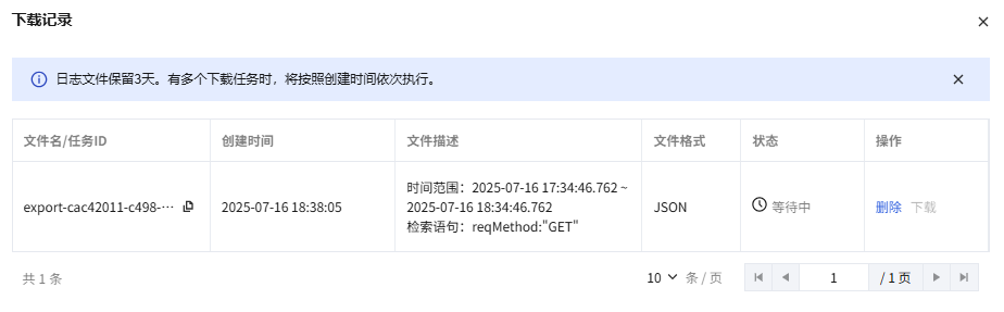 3. 进入下载记录页面,可以查看当前任务进度,支持删除和下载操作。在等待过程中,您可以退出当前页面,从右侧下载按钮中单击下载记录,即可再次进入该页面。