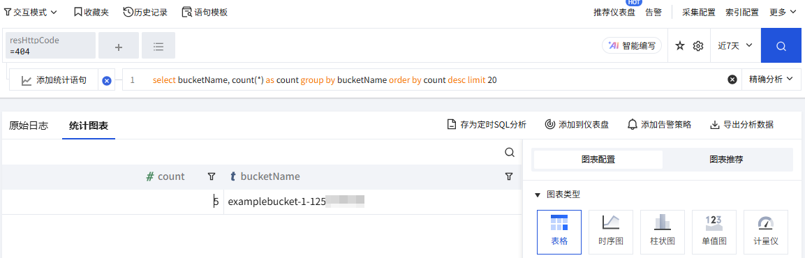 统计响应状态码为404的日志数量。更多语法使用和示例信息请参见 SQL语句语法。交互模式:通过鼠标点击指定检索条件及统计分析规则,自动生成检索分析语句,易用性高。
