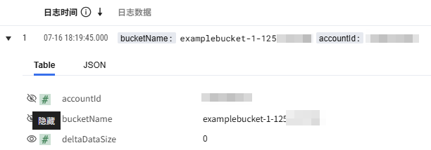 日志详情:展开某条日志查看详情,单击查看图标,即可快速隐藏或者显示某字段。针对每条日志,您还可以查看 JSON 格式的数据,并支持一键复制。除此之外,单击字段值还可以进行自定义跳转,详情参见 自定义跳转。