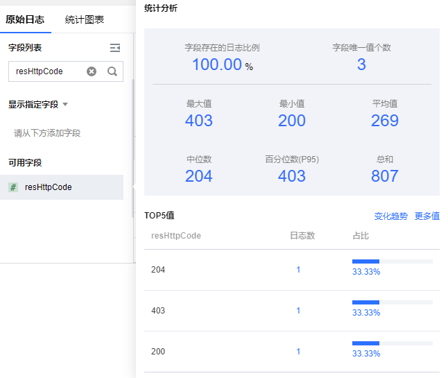 2. 单击左侧字段名称,打开快速分析,按 resHttpCode 字段进行统计分析。查看异常状态码的日志信息,例如403状态码、204状态码等。