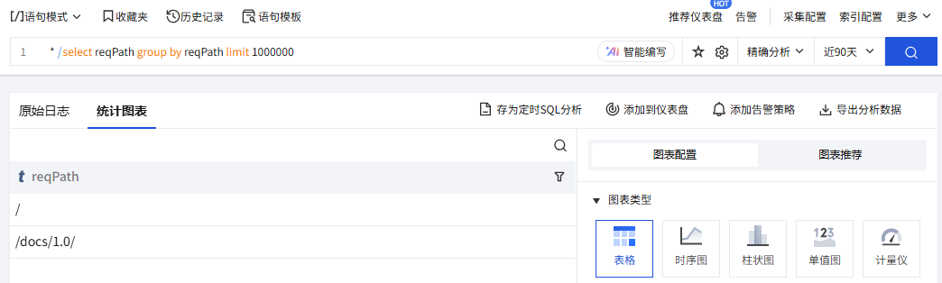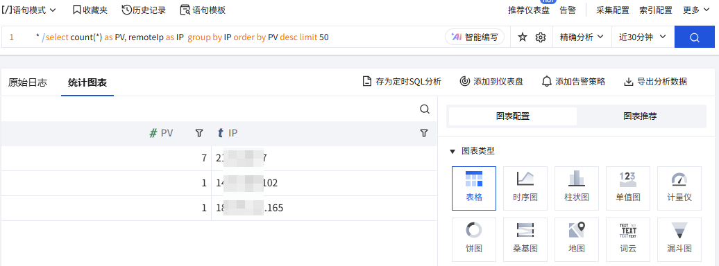 :只返回查询结果中的前50条,即 PV 排名前50的 IP。2. 选择时间范围(例如近30分钟),单击搜索查询,进入统计图表页面,即可查询仅30分钟内的统计分析结果,右侧支持切换图表类型。