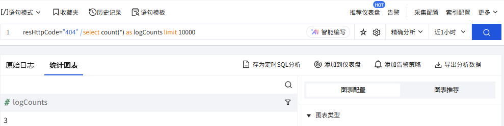 resHttpCode="404" | select count(*) as logCounts limit 10000