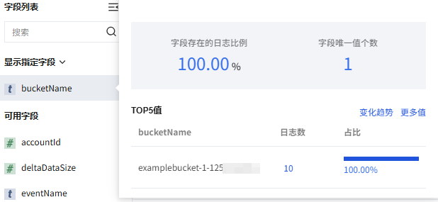 3. 开启成功后,单击对应字段可查看该字段对应的TOP5日志情况。单击某一数字,可选择在统计图表中查看或查看变化趋势,同时将自动生成对应的检索分析语句和图表。单击更多值可查看在某个时间段(默认为近15分钟)的统计数据。