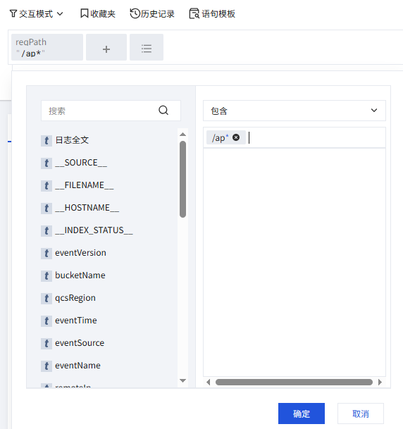 1. 选择交互模式,单击添加检索条件,指定 reqPath 包含 /ap* ,筛选出前缀为