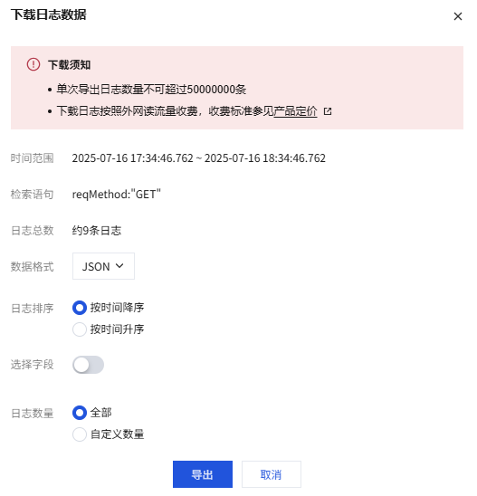 2. 在弹出的窗口中,按需配置如下信息,确认无误后,单击导出。