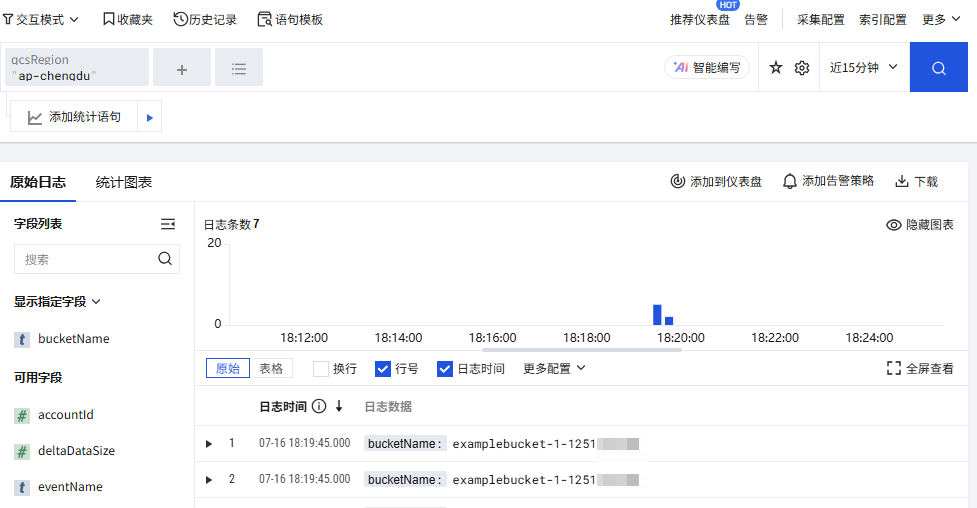 交互模式下,选择指定字段,然后配置统计分析指标,选择时间范围,单击搜索按钮即可检索该存储桶上报到 CLS 的访问日志。