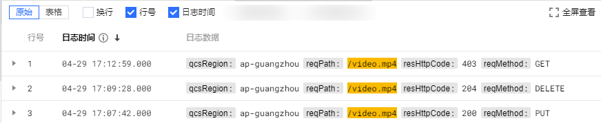 原始日志:当仅通过包含检索条件时,可在原始日志中查看匹配检索条件的日志,默认按日志时间倒排。