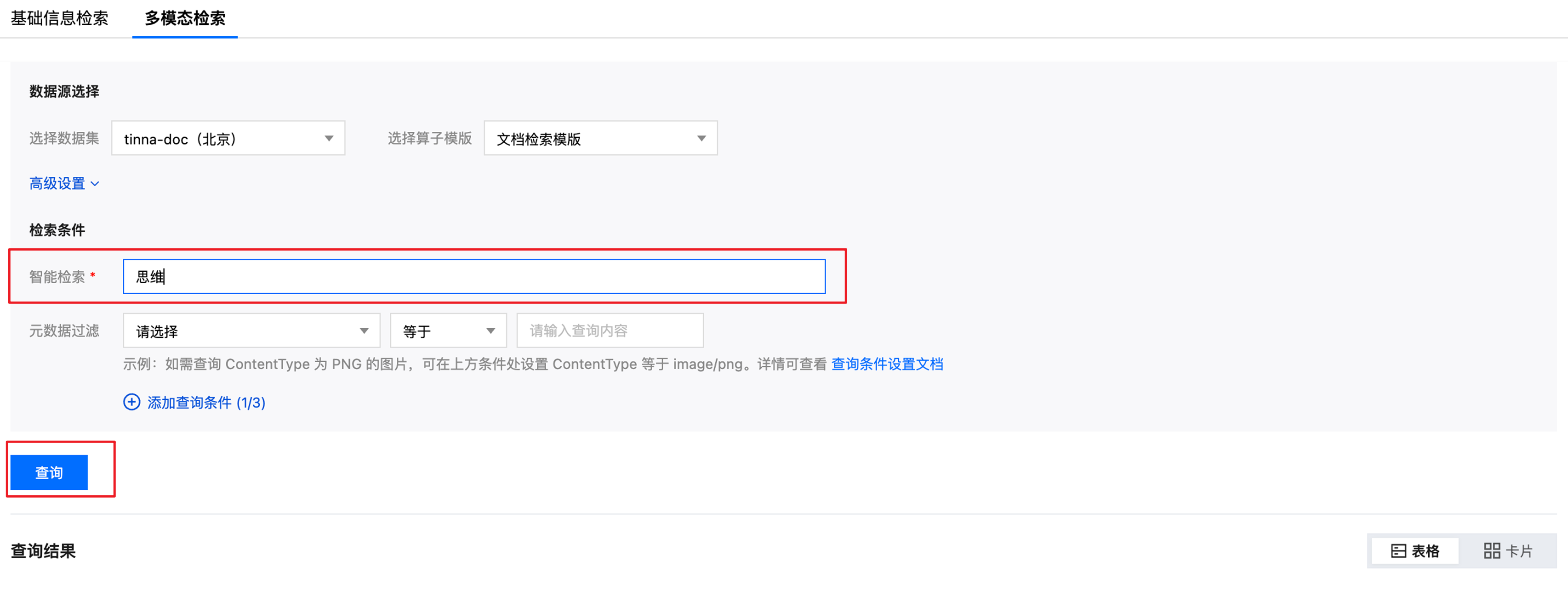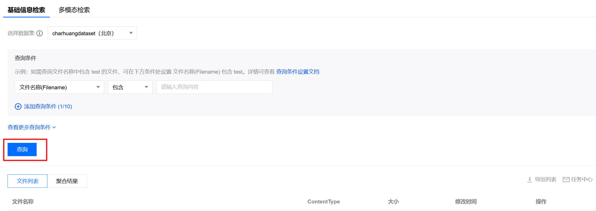 4. 选择需要进行检索的数据集。指定查询条件,如文件名称、contentType 等,条件设置规则请参见 字段和操作符的支持列表。