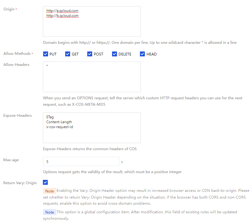 4. Configure CORS rules. Set AllowHeader to *, and ExposeHeaders should include ETag, Content-Length, and other header fields required by JavaScript, as shown in the figure below. For operation details, see the Set Cross-Origin Access documentation.