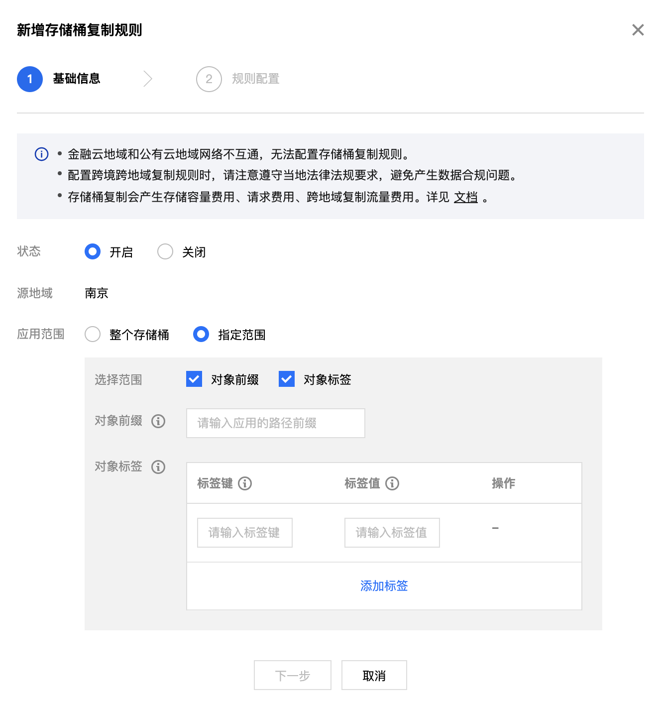 指定范围:指按照对象前缀、对象标签筛选待复制的增量对象。当您选择指定范围时,请至少配置以下其中一项: