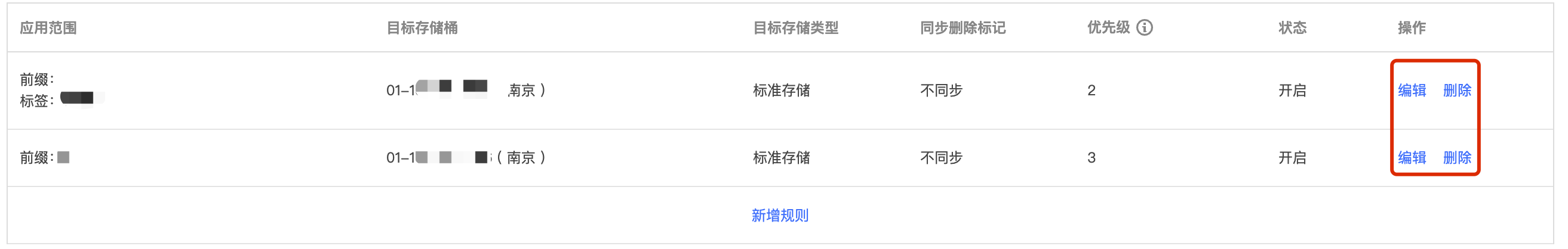 若您在功能升级之前已配置过“存储桶复制规则”,该部分规则暂无优先级,展示为“-”。详情如下: