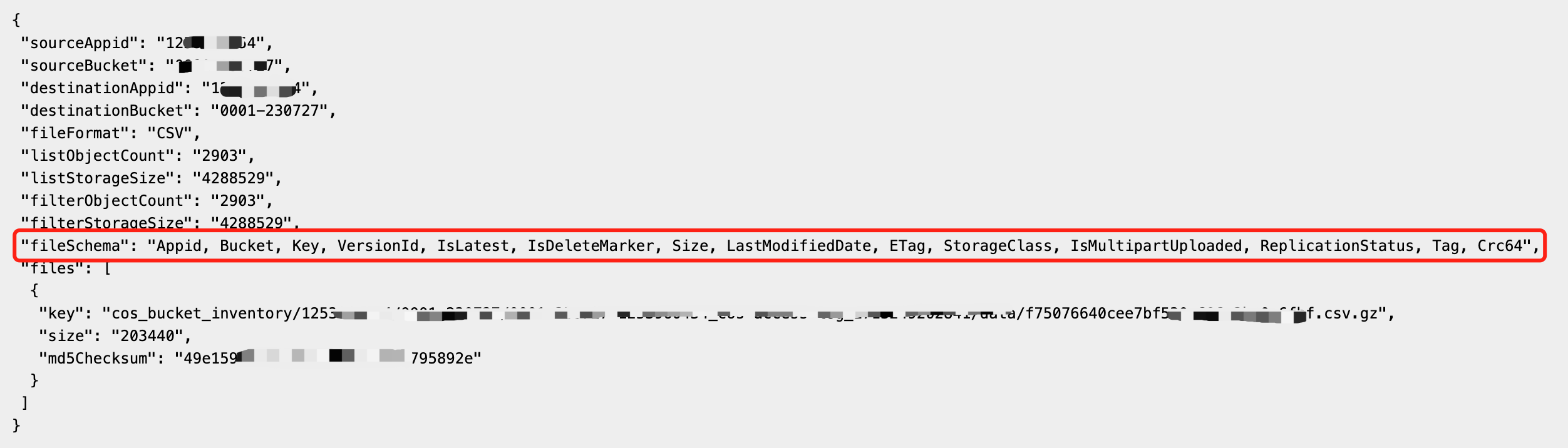 {"sourceAppid": "1250000000","sourceBucket": "example-source-bucket","destinationAppid": "1250000000","destinationBucket": "example-inventory-destination-bucket","fileFormat": "CSV","listObjectCount": "13","listStorageSize": "7212835","filterObjectCount": "13","filterStorageSize": "7212835","fileSchema": "Appid, Bucket, Key, Size, LastModifiedDate, ETag, StorageClass, IsMultipartUploaded, ReplicationStatus","files": [{"key": "cos_bucket_inventory/1250000000/examplebucket/inventory01/04d73d9debc73d9f0bf85af461abde6c.csv.gz","size": "502","md5Checksum": "7d40288a09c25b302ad6cb5fced54f35"}]}