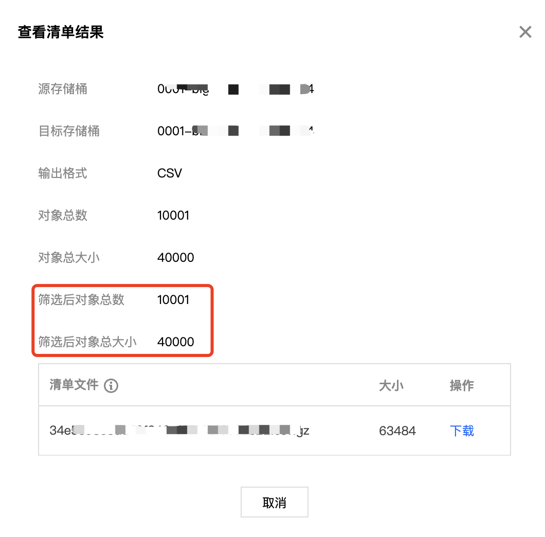 6. 若需要直接查看清单结果,在操作一列单击查看清单结果,即可看到您配置的筛选条件下的对象总数和大小。更多详细清单信息,支持点击下载进行解压查看。