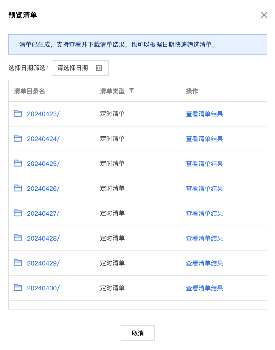 4. 预览清单页面会展示当前规则下生成的所有清单,包括定时清单和即时清单。您可以一键前往清单目录和查看清单结果,并支持筛选日期、清单类型。