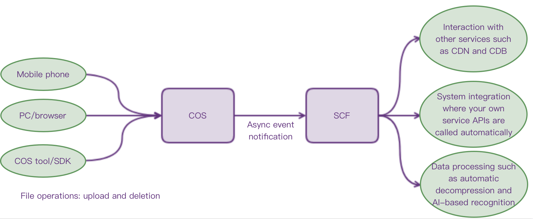 Interaction with other Tencent Cloud services: For example, purge CDN cache or update the database when a new file is uploaded to COS.