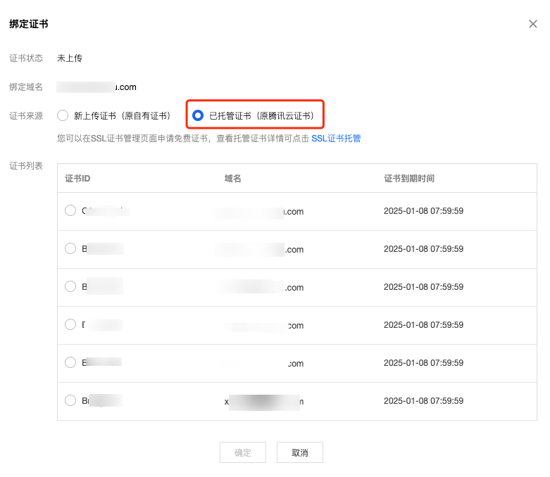 已托管证书:原腾讯云证书。若您希望使用腾讯云申请的证书,请选择此项。