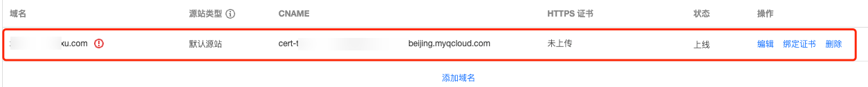 6. 配置完成后,单击创建,即可在列表页看到已配置的自定义源站域名。