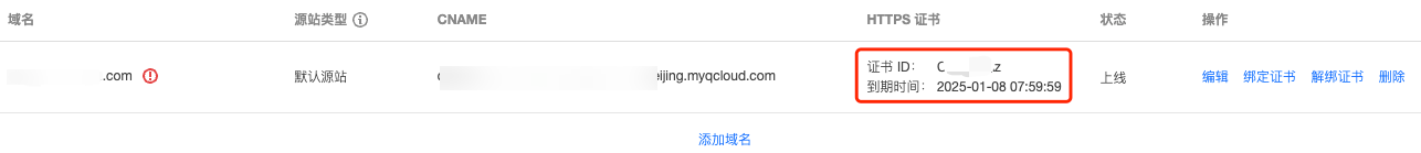 9. 绑定成功后,在自定义源站列表页,您可看到当前证书的证书ID和到期时间。