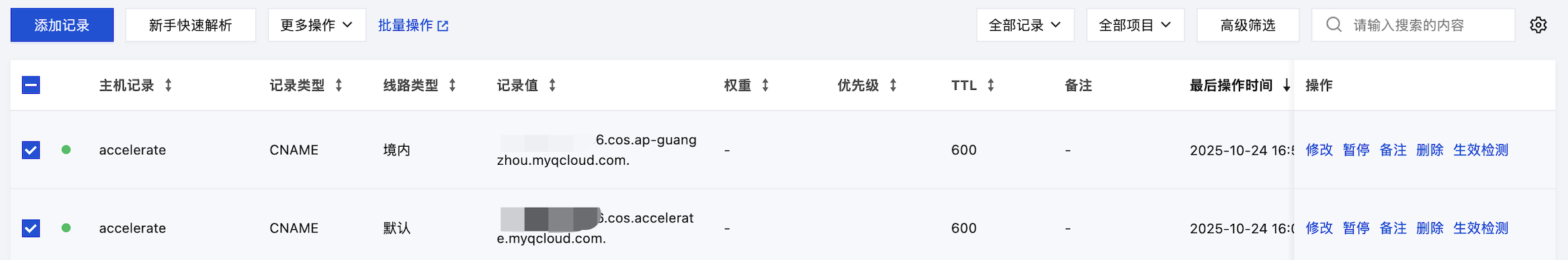 2. 单击添加记录,创建2条 CNAME 记录(例如,主机记录设置为 accelerate)。第一条解析记录的线路类型设置为境内,记录值设置为存储桶的默认域名