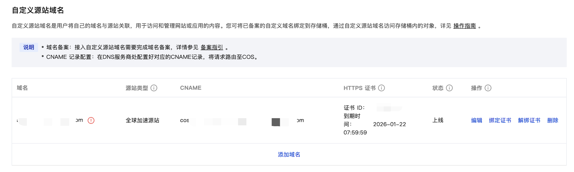 import COS from 'cos-js-sdk-v5';const cos = new COS({SecretId: 'your_tmpSecretId', // sts 服务下发的临时 secretIdSecretKey: 'your_tmpSecretKey', // sts 服务下发的临时 secretKeySecurityToken: 'your_sessionToken', // sts 服务下发的临时 SessionTokenDomain: 'your.custom.domain' //传入自定义域名});