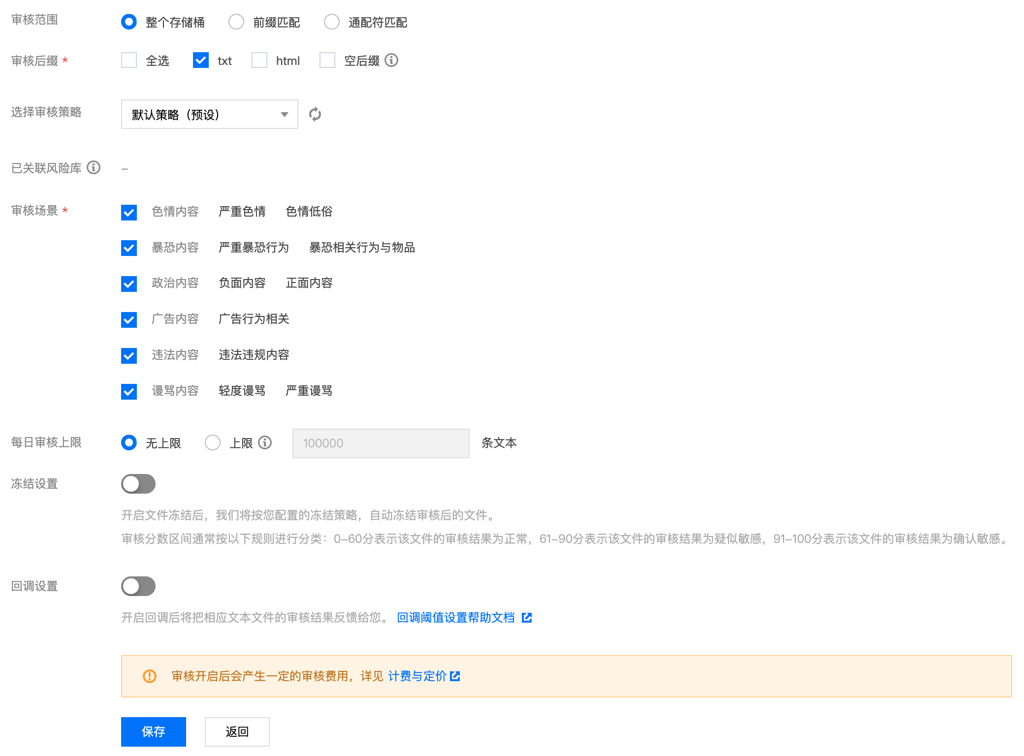 5. 配置完成后,单击保存即可启用该功能,后续将对您新上传的文本进行审核。