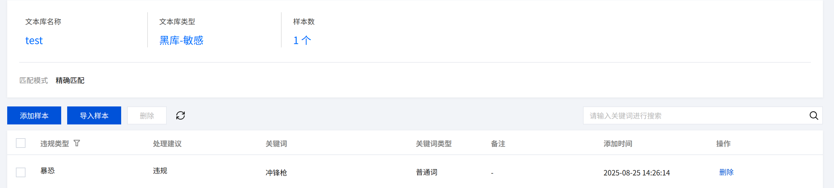 添加样本:您可以往文本库中添加指定的关键词作为样本。