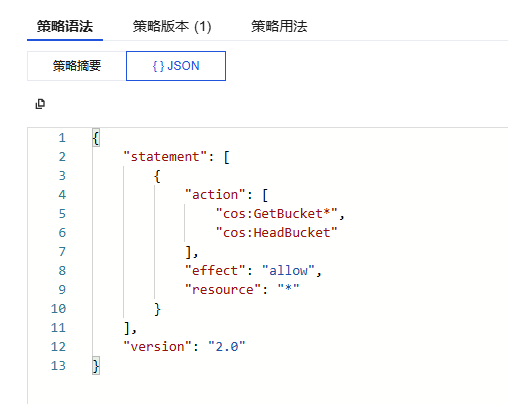 ),且不支持修改。若您需要对部分 COS 存储桶、对象授权,可以复制 JSON 的预设策略,创建 自定义策略。