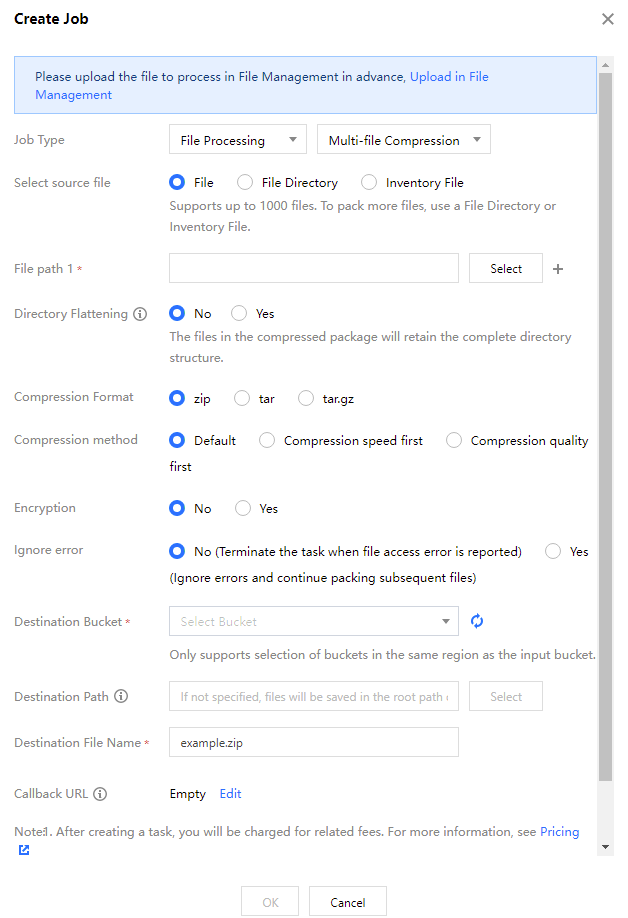 5. Select the File Processing tab, choose the Multi-file Compression task type, click Create Task, and configure according to the following information: