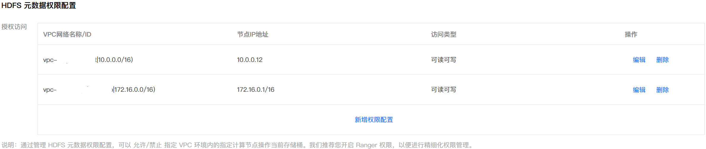 在 已开启元数据加速的存储桶 中,选择湖存储配置 > HDFS 元数据权限配置,配置 Kubernetes 集群的 VPC 网络。配置指引请参见 配置HDFS协议说明。