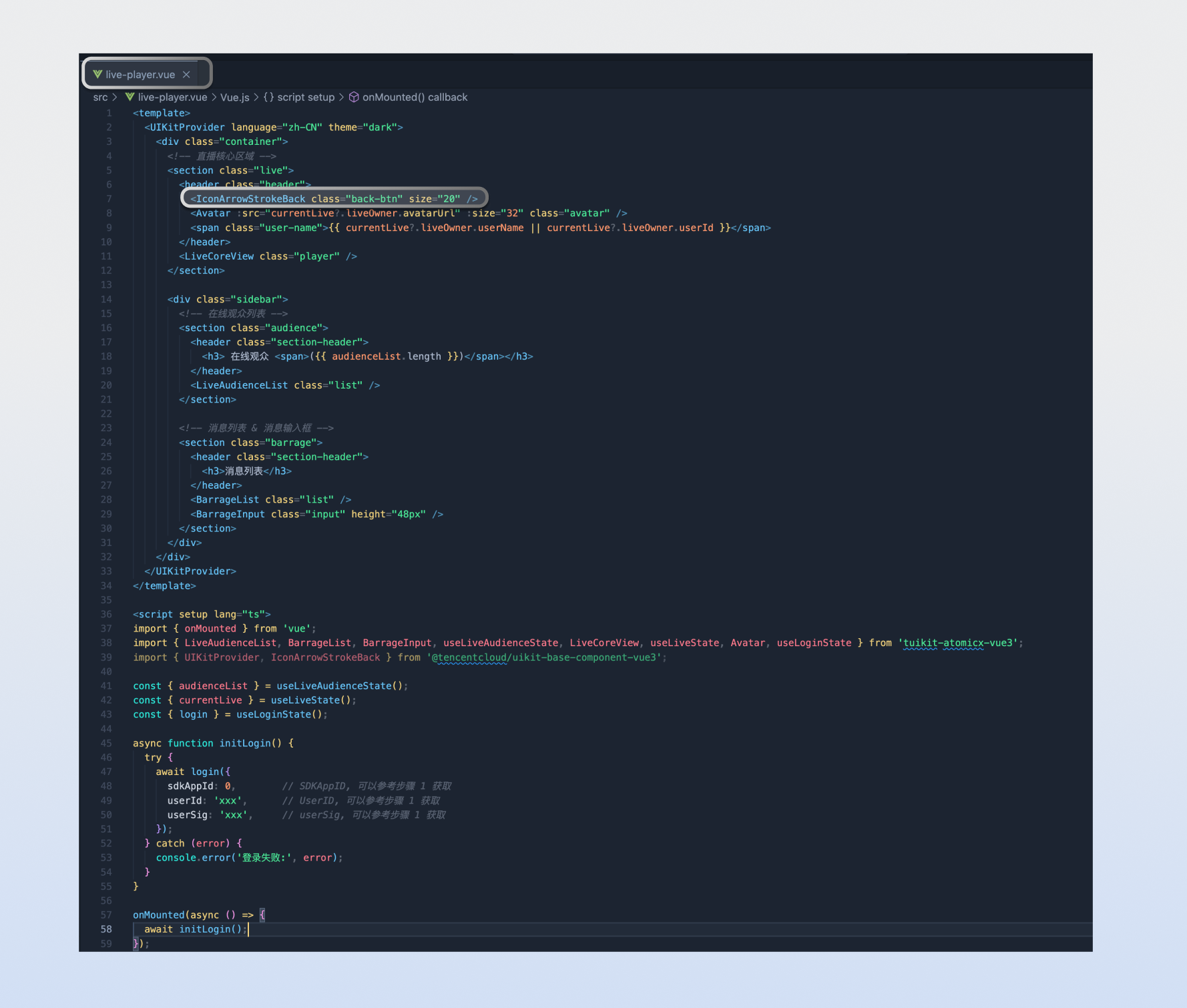 <template><UIKitProvider language="zh-CN"><div class="container"><!-- 直播核心区域 --><section class="live"><header class="header"><IconArrowStrokeBack class="back-btn" size="20" /><Avatar :src="currentLive?.liveOwner.avatarUrl" :size="32" class="avatar" /><span class="user-name">{{ currentLive?.liveOwner.userName || currentLive?.liveOwner.userId }}</span></header><LiveCoreView class="player" /></section><div class="sidebar"><!-- 在线观众列表 --><section class="audience"><header class="section-header"><h3> 在线观众 <span>({{ audienceList.length }})</span></h3></header><LiveAudienceList class="list" /></section><!-- 消息列表 & 消息输入框 --><section class="barrage"><header class="section-header"><h3>消息列表</h3></header><BarrageList class="list" /><BarrageInput class="input" height="48px" /></section></div></div></UIKitProvider></template><script setup lang="ts">import { onMounted } from 'vue';import { LiveAudienceList, BarrageList, BarrageInput, useLiveAudienceState, LiveCoreView, useLiveListState, Avatar, useLoginState } from 'tuikit-atomicx-vue3';import { UIKitProvider, IconArrowStrokeBack } from '@tencentcloud/uikit-base-component-vue3';const { audienceList } = useLiveAudienceState();const { currentLive } = useLiveListState();const { login } = useLoginState();const liveId = 'live_xxxx' // 填入您要观看的直播间的IDasync function initLogin() {try {await login({sdkAppId: 0, // SDKAppID, 可以参考步骤 1 获取userId: 'xxx', // UserID, 可以参考步骤 1 获取userSig: 'xxx', // userSig, 可以参考步骤 1 获取});} catch (error) {console.error('登录失败:', error);}}onMounted(async () => {await initLogin();});</script><style>:global(body){height:100vh;width:100vw;margin:0;padding:0;overflow:hidden;font-size:15px;line-height:1.6;text-rendering:optimizeLegibility;}:global(*),:global(*::before),:global(*::after){box-sizing:border-box;margin:0;}.container{display:grid;grid-template-columns:70% 30%;height:100vh;width:100vw;gap:16px;padding:16px;background:var(--bg-color-default);box-sizing:border-box;overflow:hidden;}.live{display:flex;flex-direction:column;background:var(--bg-color-operate);border-radius:12px;overflow:hidden;box-shadow:0 2px 8px var(--shadow-color);}.header{display:flex;align-items:center;gap:12px;padding:16px;border-bottom:1px solid var(--stroke-color-primary);}.back-btn{cursor:pointer;color:var(--text-color-tertiary);transition:color 0.2s;}.back-btn:hover{color:var(--text-color-link-hover);}.avatar{border:1px solid var(--uikit-color-white-7);}.user-name{color:var(--text-color-primary);font-weight:500;}.player{flex:1;background:var(--uikit-color-black-1);}.sidebar{display:flex;flex-direction:column;gap:16px;height:100%;overflow:hidden;}.audience{display:flex;flex-direction:column;background:var(--bg-color-operate);border-radius:12px;overflow:hidden;box-shadow:0 2px 8px var(--shadow-color);flex:1;min-height:0;}.barrage{display:flex;flex-direction:column;background:var(--bg-color-operate);border-radius:12px;overflow:hidden;box-shadow:0 2px 8px var(--shadow-color);flex:1;min-height:0;}.section-header{padding:16px;border-bottom:1px solid var(--stroke-color-primary);background:var(--bg-color-operate);}.section-header h3{margin:0;font-size:16px;font-weight:600;color:var(--text-color-primary);}.section-header span{font-weight:400;color:var(--text-color-secondary);font-size:14px;}.list{flex:1;min-height:0;overflow-y:auto;}.input{border-top:1px solid var(--stroke-color-primary);flex-shrink:0;height:48px;}@media (max-width:1200px){.container{grid-template-columns:1fr;grid-template-rows:60% 20% 20%;gap:12px;}.sidebar{gap:12px;}.audience,.barrage{min-height:200px;}}@media (max-width:768px){.container{padding:8px;gap:8px;grid-template-rows:50% 25% 25%;}.header,.section-header{padding:12px;}.sidebar{gap:8px;}}</style>