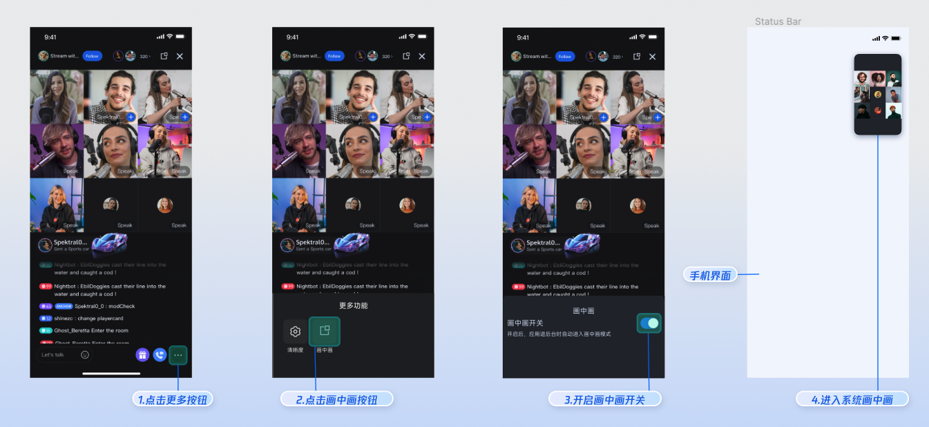 依次点击观看页面右下角的更多 > 画中画,打开画中画开关。然后,您的 App 退到后台时,将自动进入到系统画中画模式,效果如图所示: