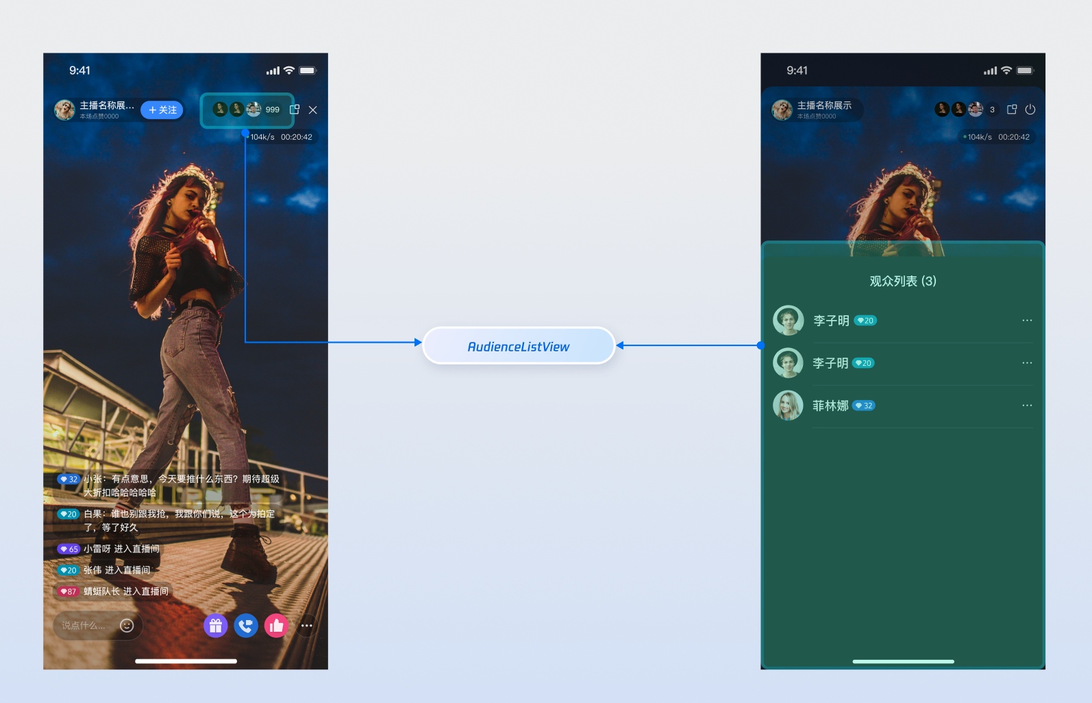 以主播开播的场景为例,将 AudienceListView 添加到您的主播视图控制器中,示例代码如下: