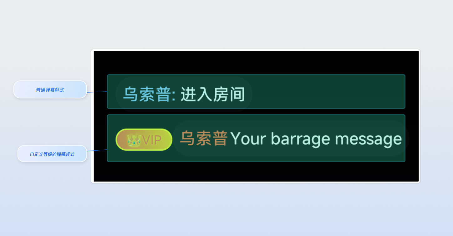 弹幕消息样式默认有两种:普通弹幕(样式为 0)和自定义消息样式。如果您需要更多样式,可实现