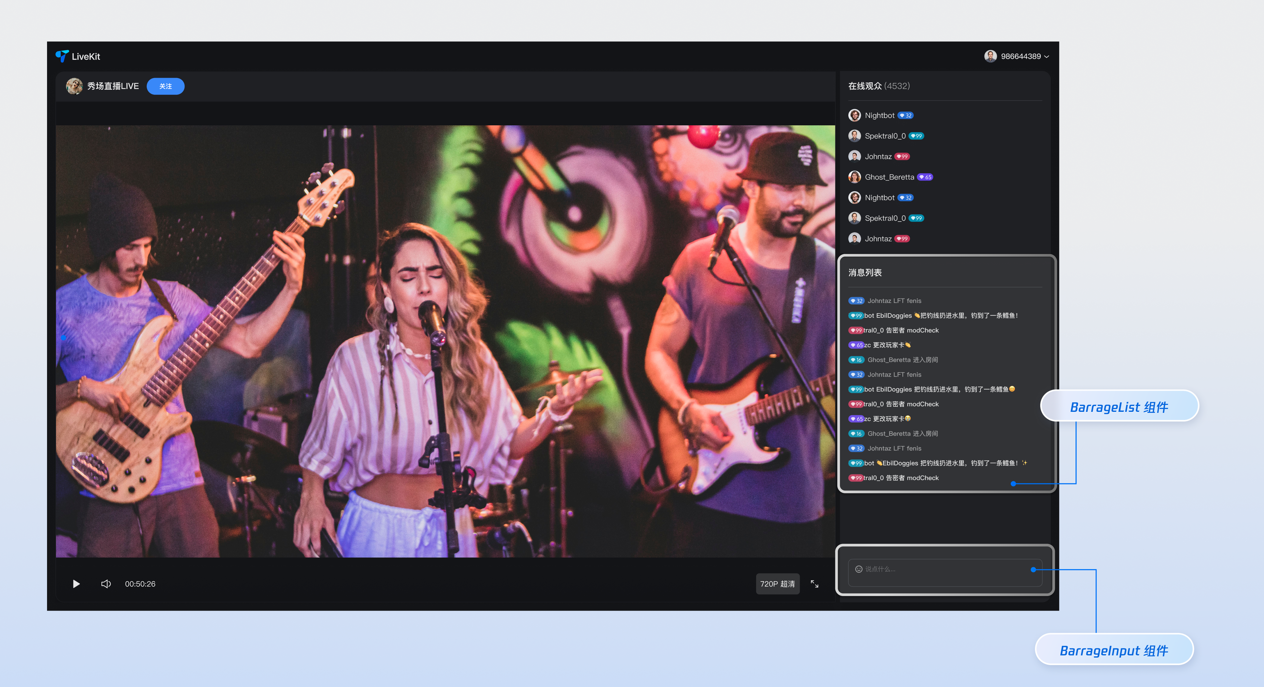 在您的项目中引入并使用弹幕组件,可直接复制如下示例至您的项目中展示完整的直播间弹幕消息组件以及消息发送组件。