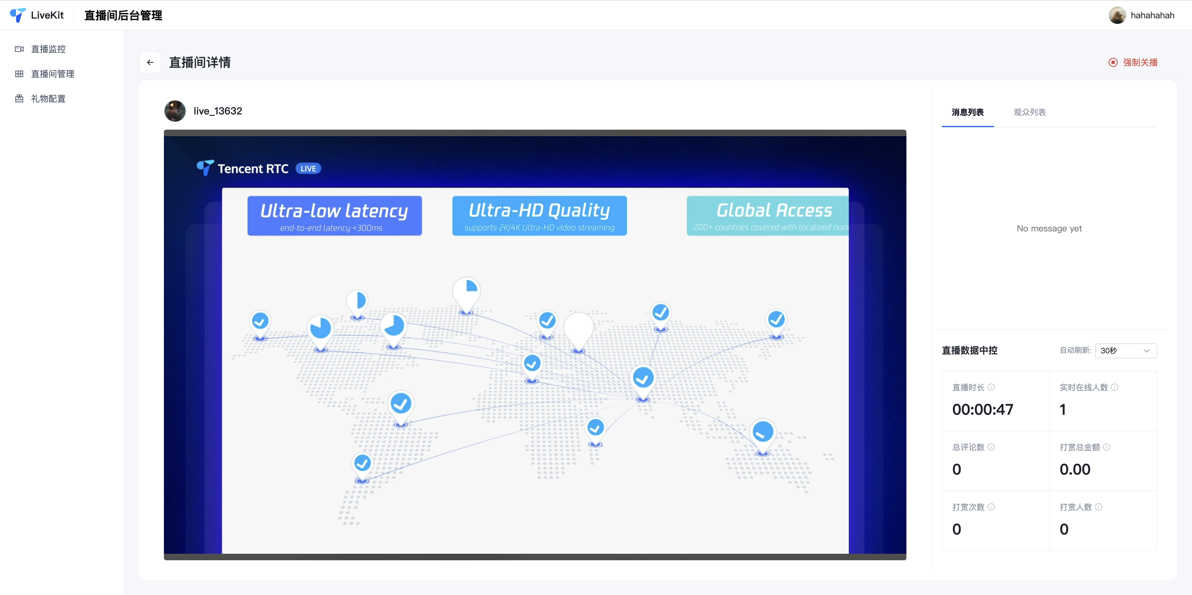 直播监控:多路同屏监播、低延迟播放、房间搜索、强制关播。