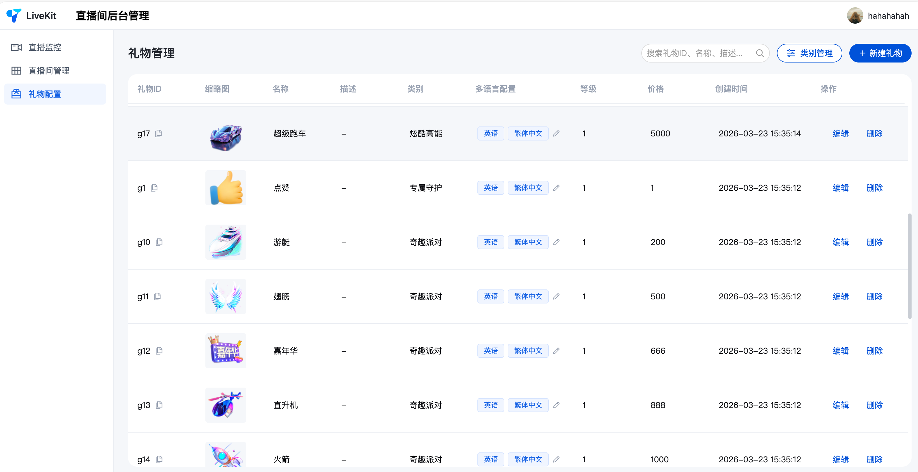 礼物配置:礼物增删改、分类管理、多语言配置。