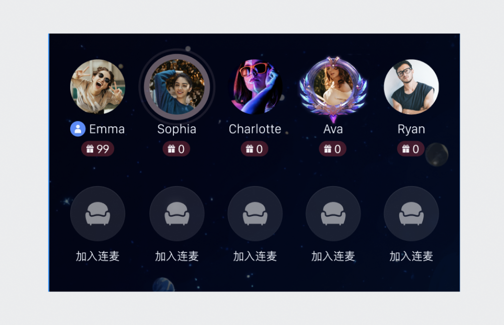 麦位管理:支持房主对麦位进行锁定、禁麦、以及观众申请上麦、主播邀请观众上麦。