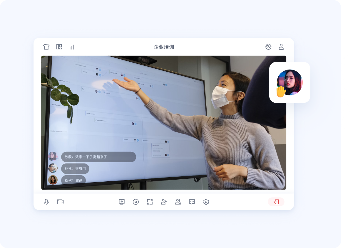 会议控制:可以对所有成员进行管控,全体静音/禁视频、移出房间、转交主持人、邀请成员开启音视频参与发言等、仅房主/管理员可屏幕共享(全体禁止屏幕共享)。