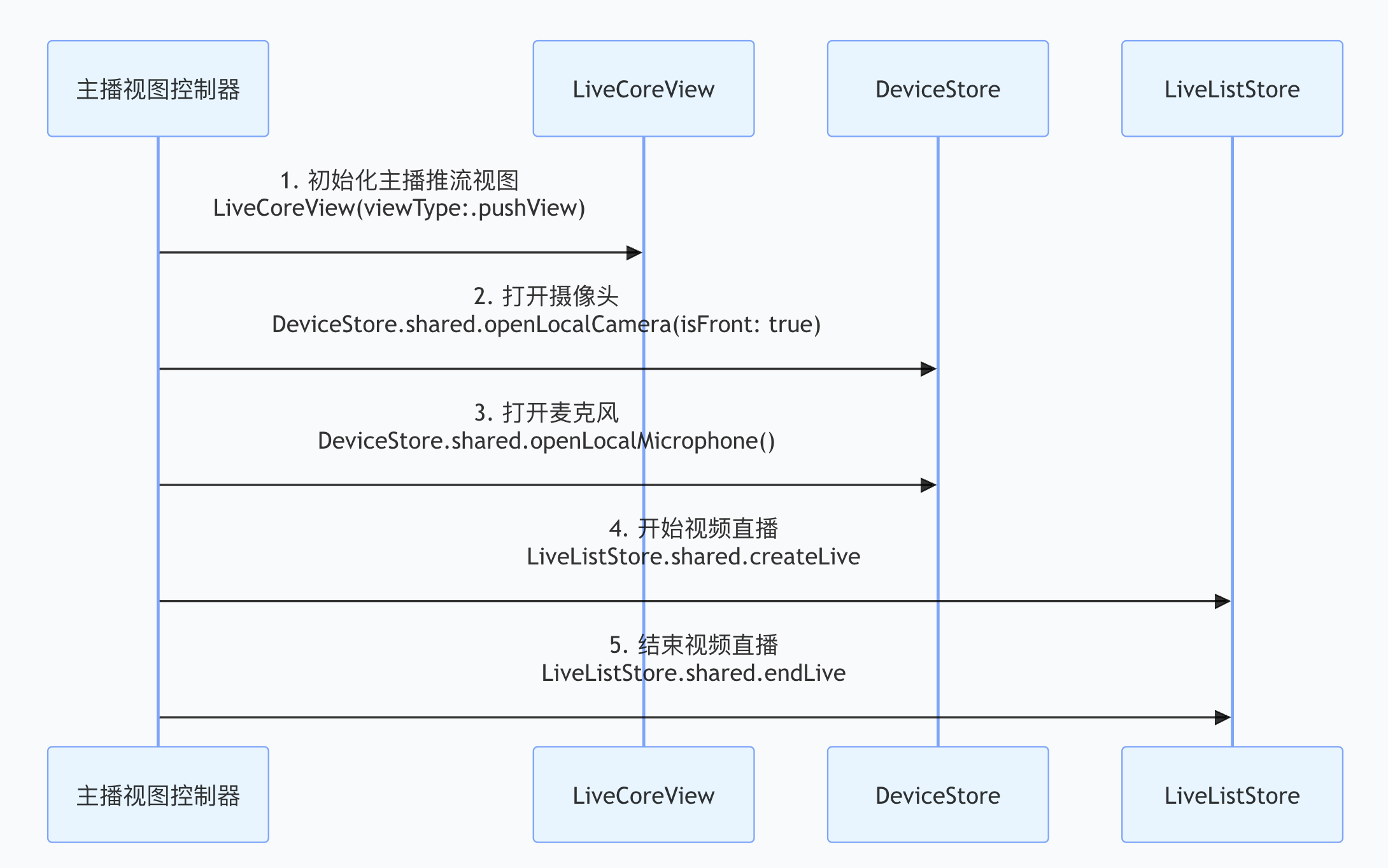 openLocalCamera、openLocalMicrophone 接口打开摄像头和麦克风,您无需做额外操作,LiveCoreView 会自动预览当前摄像头的视频流,示例代码如下:import AtomicXCore// YourAnchorViewController 代表您的主播开播视图控制器class YourAnchorViewController: UIViewController {// ... 其他代码 ...public override func viewDidLoad() {super.viewDidLoad()// 打开设备openDevices()}private func openDevices() {// 1. 打开前置摄像头DeviceStore.shared.openLocalCamera(isFront: true, completion: nil)// 2. 打开麦克风DeviceStore.shared.openLocalMicrophone(completion: nil)}}