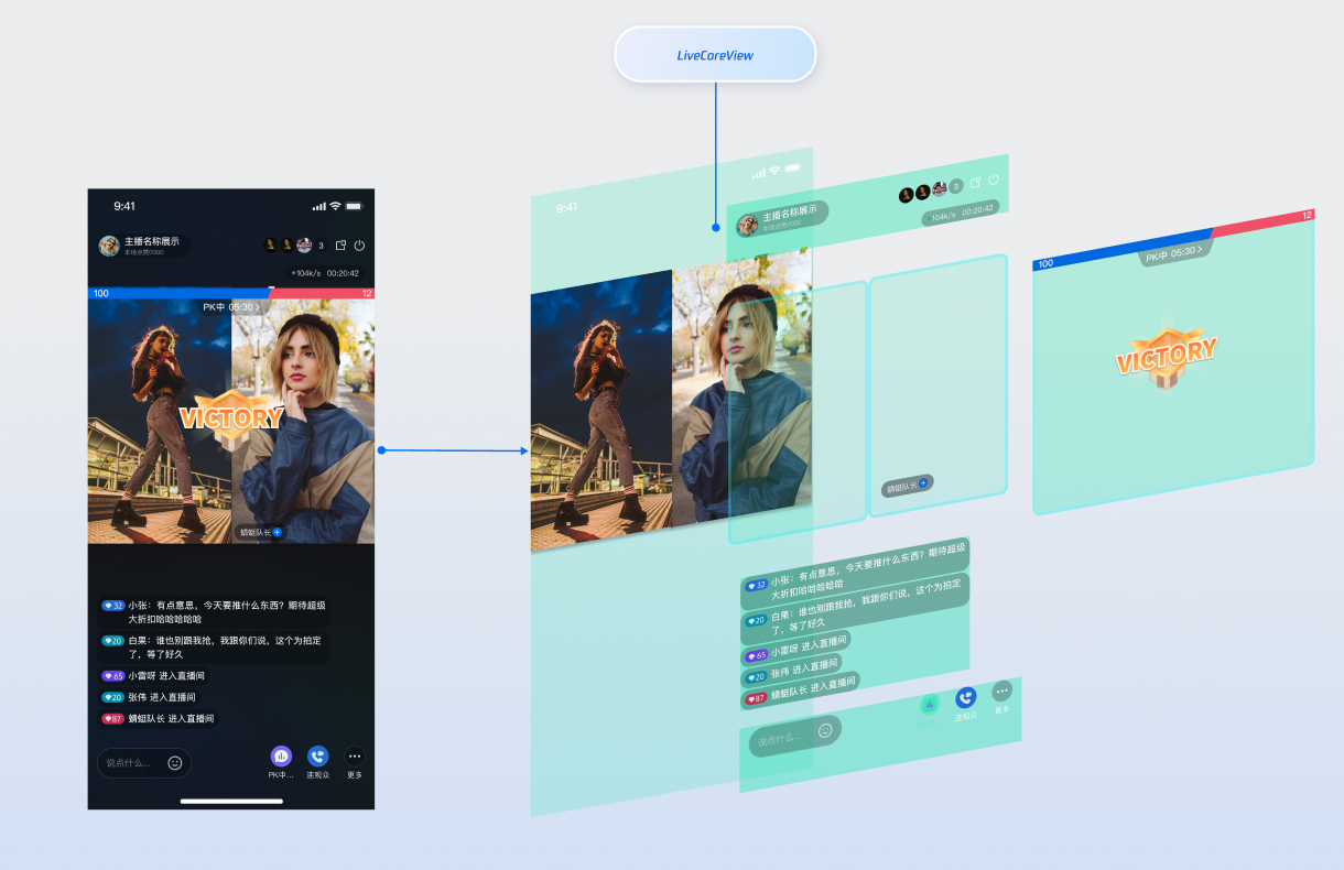 LiveCoreView | 直播视频流展示与交互的核心视图组件:负责视频流渲染和视图挂件处理,支持主播直播、观众连麦、主播连线等场景。 | |