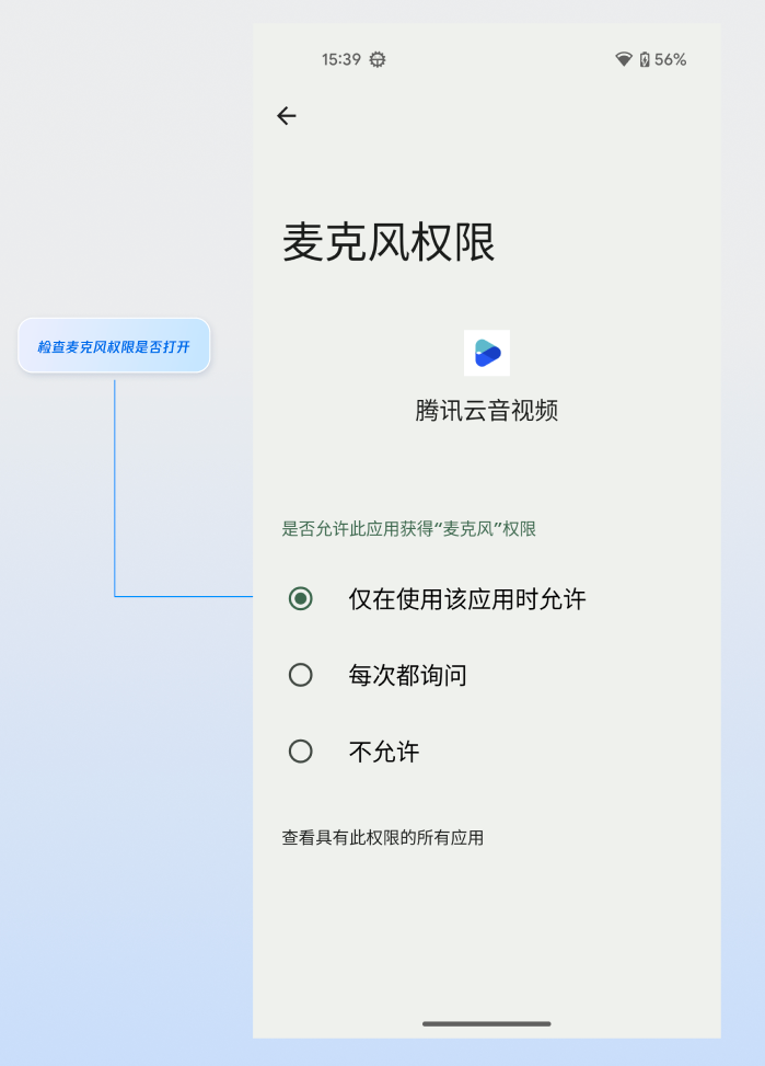 App 麦克风权限。您可以前往手机 应用信息 > 权限 > 麦克风,检查“麦克风”权限是否已开启。