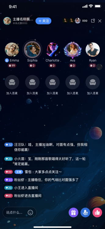 观众互动: 支持弹幕、礼物、点赞 等丰富的直播互动形式。