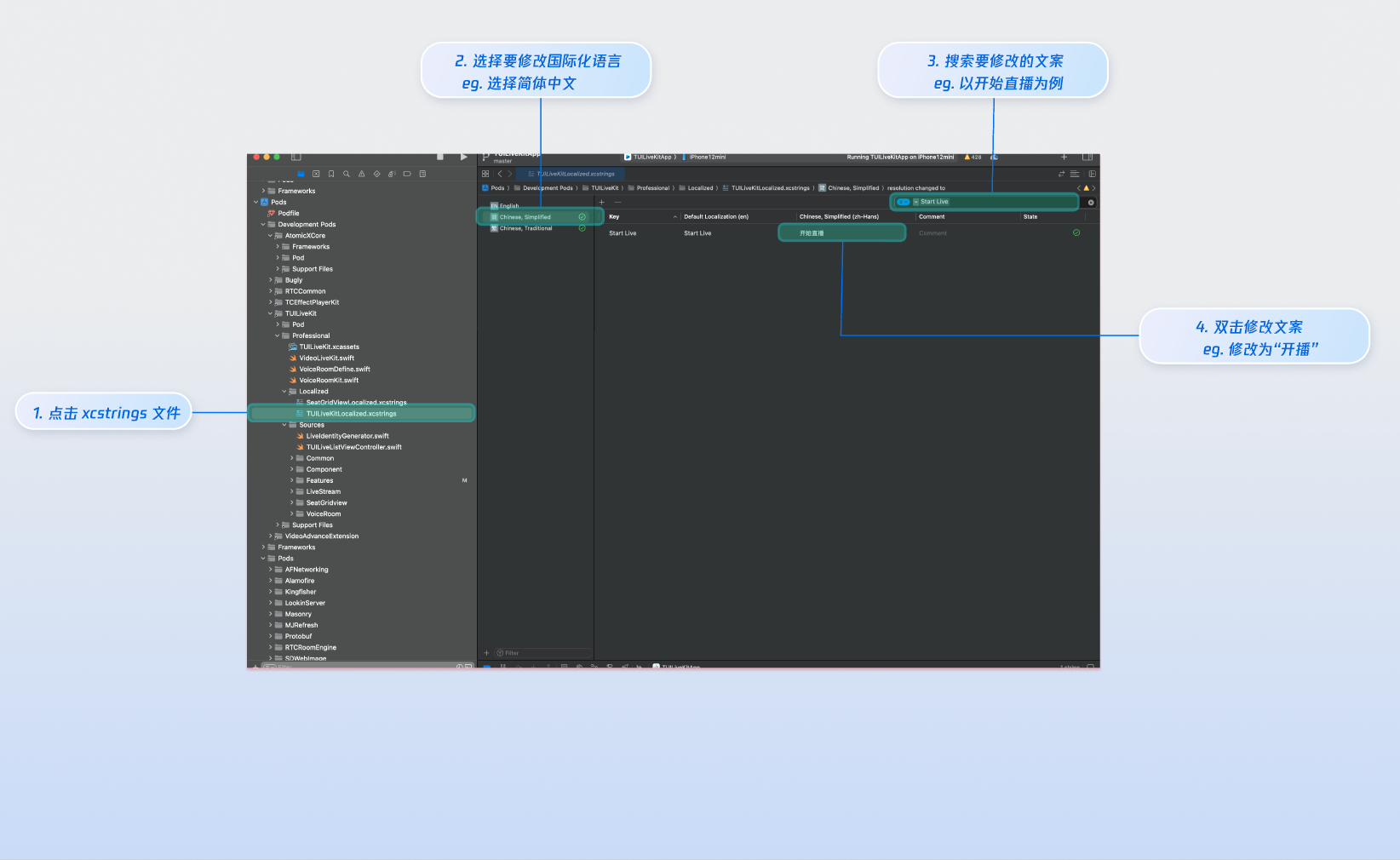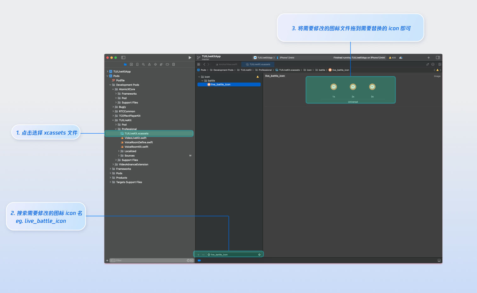 TUILiveKit.xcassets管理 UI 所需的图片资源,您可以借助 Xcode 图形化工具快速替换图标。