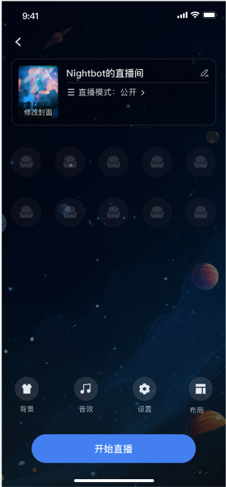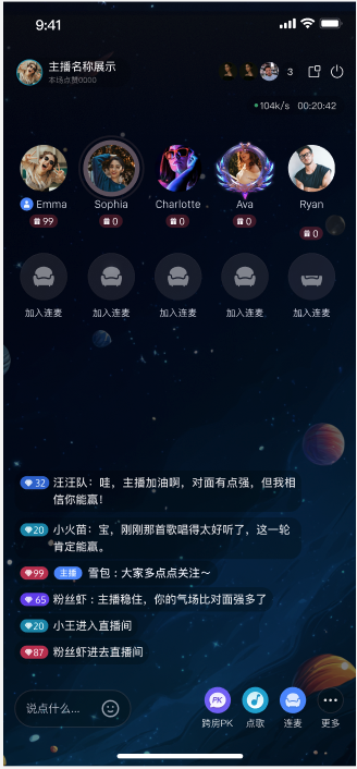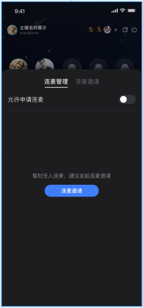 开播前预览 | 麦位管理 | 观众互动 | 直播间管理 |