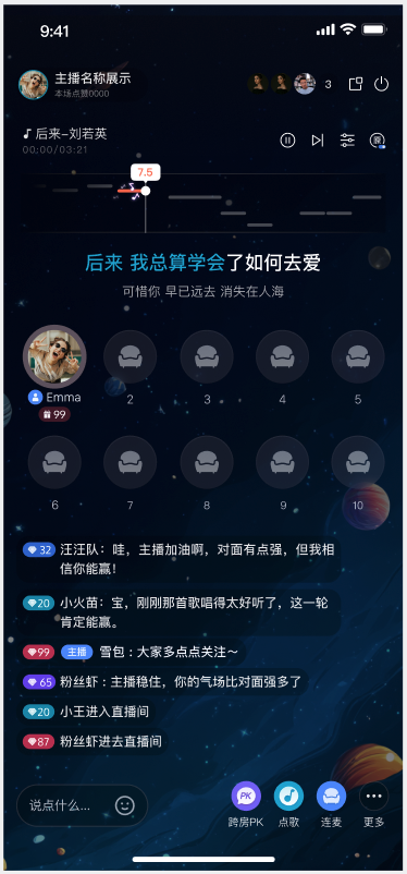 TUILiveKit语聊房为纯音频直播场景提供了开箱即用的全功能界面。它支持快速搭建主播开播所需的核心能力,让您无需关注复杂的 UI 与麦位管理逻辑,即可高效集成语聊房开播流程。功能概览